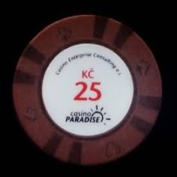 | 36. | Casino Paradise Czechoslovakia, 25.00 Brown chip, black inserts, circle inlay, 4 Suits inserts