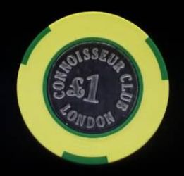 | 67. | Connoisseur Club London England, 1.00 Yellow chip, circle inlay, coin center, 3 blue inserts