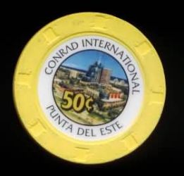 | 68. | Conrad International Punta Del Este Uruguay, 0.50 Yellow chip, TH mold, map of Uruguay