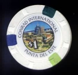 | 69. | Conrad International Punta Del Este Uruguay, 1.00 White chip, green/dk green/dk blue inserts, map of Uruguay