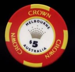 | 77. | Crown Melbourne Australia, 5.00 Red chip, 4 mustard inserts, circle inlay