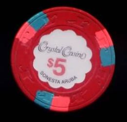 | 80. | Crystal Casino Sonesta Aruba, 5.00 Red chip, H&C mold, 3 green/peach inserts, scalloped inlay