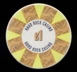 | 102. | Hard Rock Casino London England, 1.00 Wide yellow chip, 8 Hard Rock inserts, circle inlay
