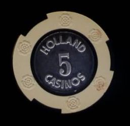 | 104. | Holland Casinos Netherlands, 5.00 Tan chip, Rose mold, 3 wide black inserts, metal inlay