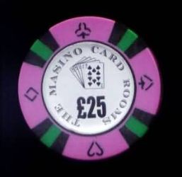 | 123. | Masino Card Rooms London England, 25.00 Pink chip, 4 balck/green inserts, 4 suits inserts, white circle inlay