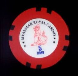 | 128. | Myanmar Royal Casino Yangon Myanmar, 5.00 Red chip, animal in white center, 4 pairs of short dk green inserts