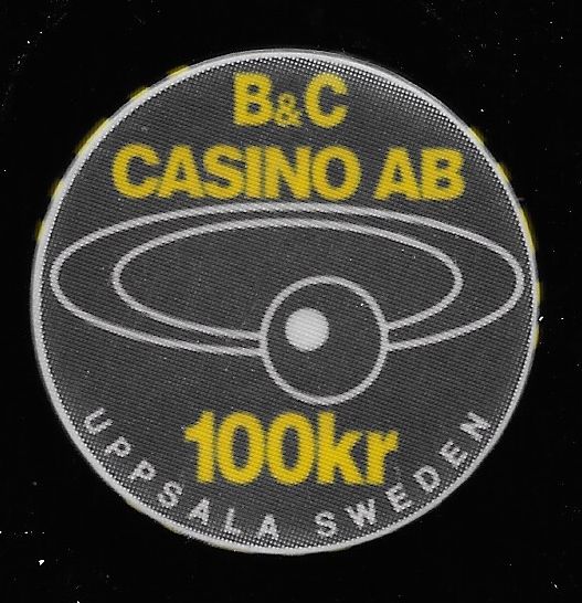 | 13. | B&C Casino AB Uppsala Sweden, 100.00 Smooth finish, black chip, orbiting planet, 3 white/blue rim stripes