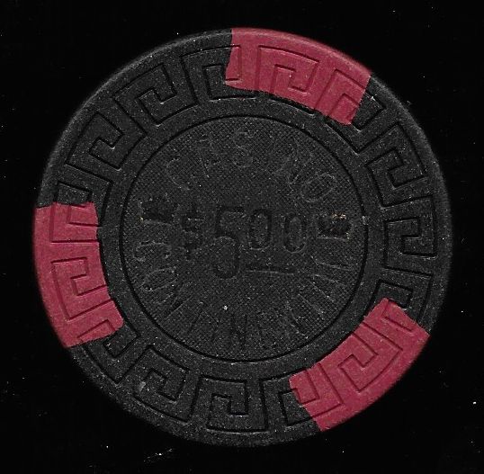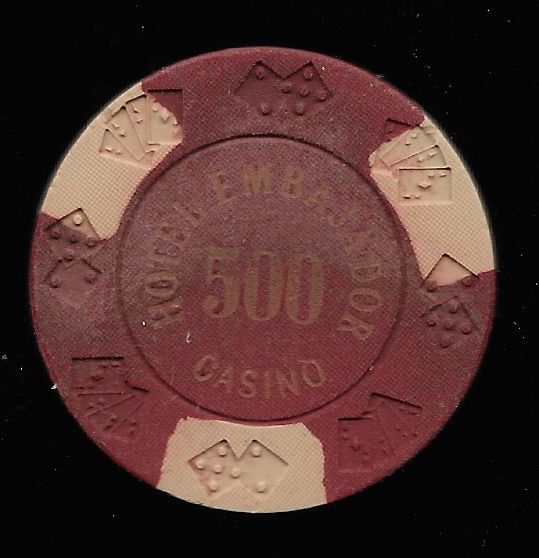 | 111. | Hotel Embajador Dominican West Indies, 500.00 Maroon chip, 3 peach inserts, Langworthy inlay, DieCards mold