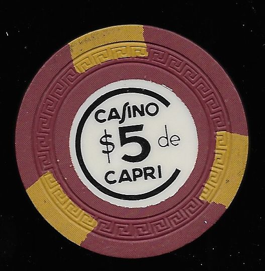 | 25. | Casino de Capri Havana Cuba, 5.00 Maroon chip, 3 mustard inserts, small key mold, circle inlay