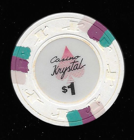| 32. | Casino Krystal Costa Rica, 1.00 White chip, 3 yellow/purple/green inserts, circle inlay, H&C mold