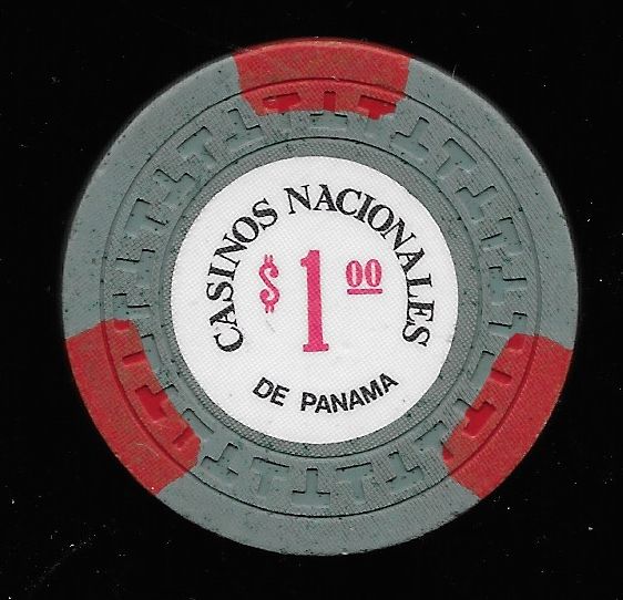 | 39. | Casinos Nacionales Panama, 1.00 Gray chip, 3 wide red inserts, T mold, large denom
