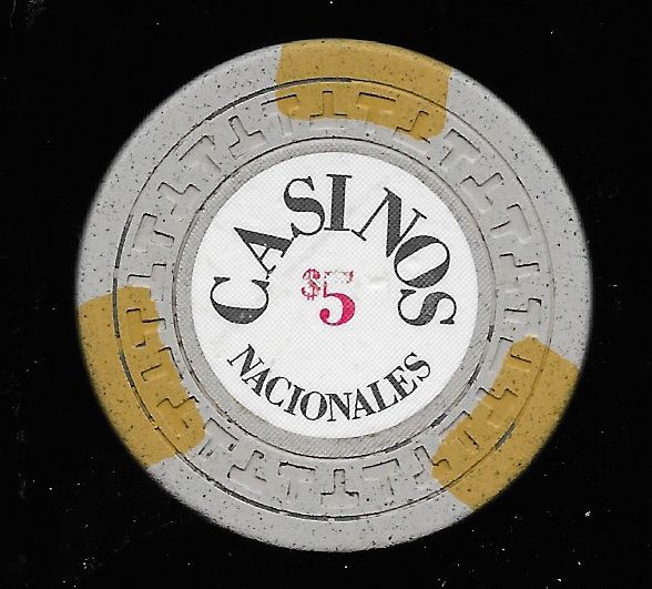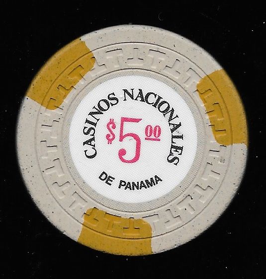 | 46. | Casinos Nacionales Panama, 5.00 Gray chip, 3 wide mustard inserts, T mold, large letters