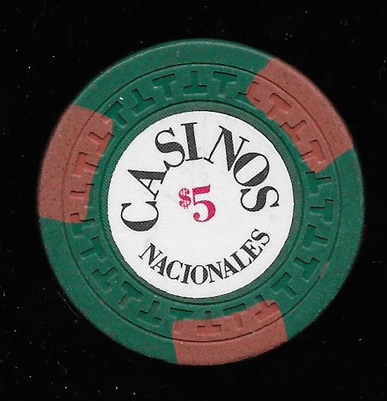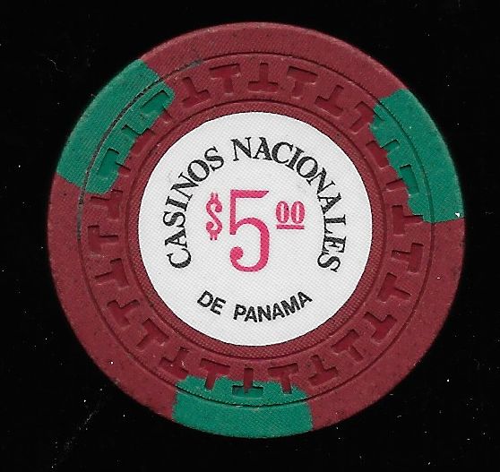 | 48. | Casinos Nacionales Panama, 5.00 Green chip, 3 wide brown inserts, T mold, large letters