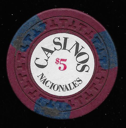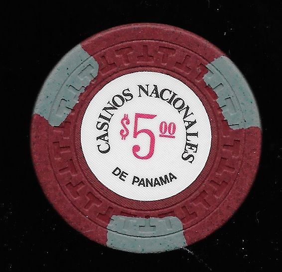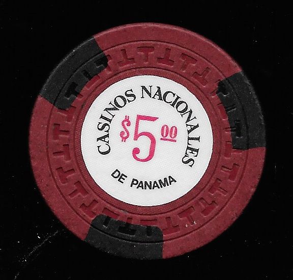 | 51. | Casinos Nacionales Panama, 5.00 Maroon chip, 3 wide navy inserts, T mold, large letters