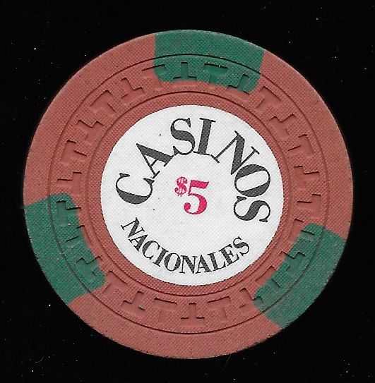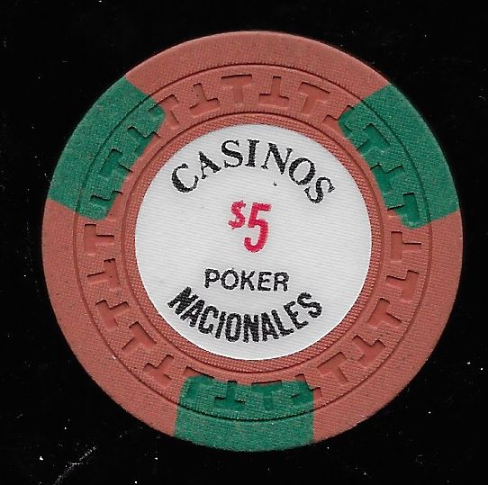 | 50. | Casinos Nacionales Panama, 5.00 Brown chip, 3 wide green inserts, T mold, large letters