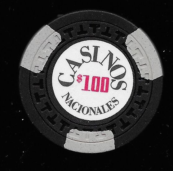 | 57. | Casinos Nacionales Panama, 100.00 Black chip, 3 wide tan inserts, T mold, large letters
