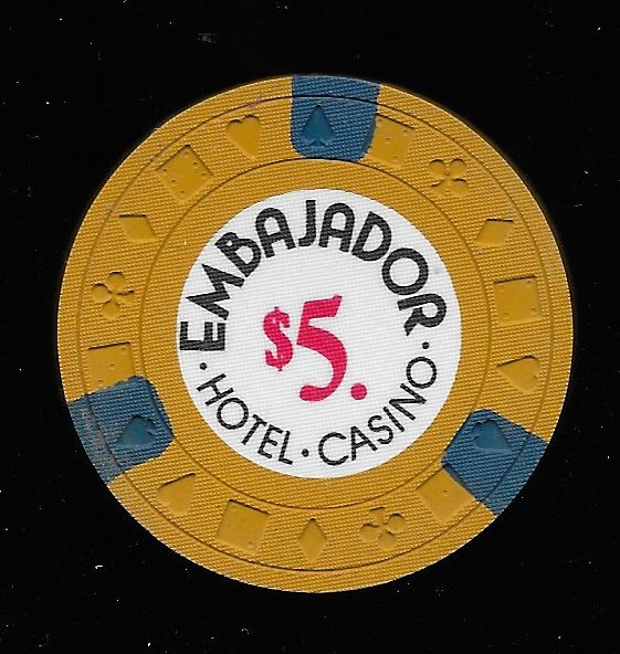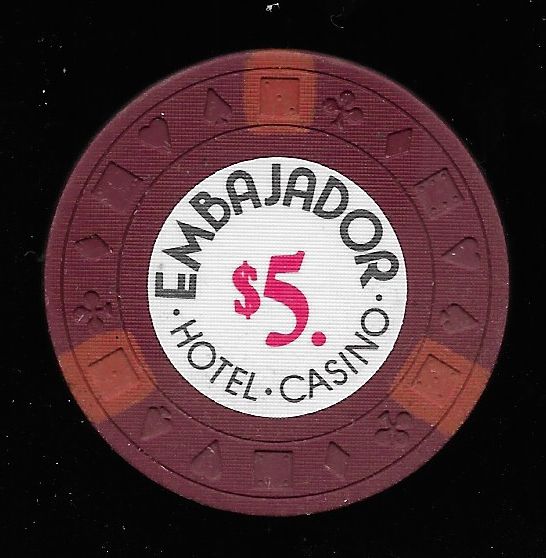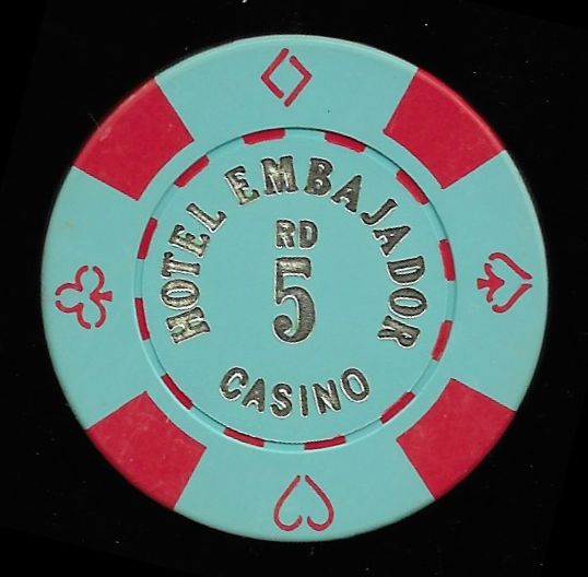 | 108. | Hotel Embajador Dominican West Indies, 5.00 Light blue chip, 4 red inserts, Langworthy inlay, 4Suits mold