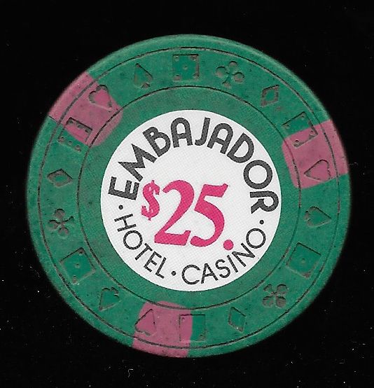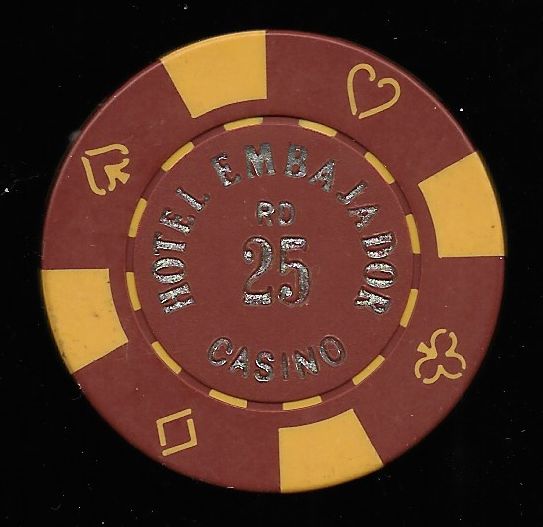 | 109. | Hotel Embajador Dominican West Indies, 25.00 Maroon chip, 4 yellow inserts, Langworthy inlay, 8Suits mold