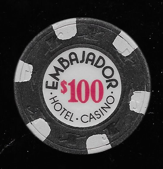 | 90. | Embajador Hotel Casino Dominican West Indies, 100.00 Black chip, 6 white inserts, circle inlay, 12 Suits 6 Die mold