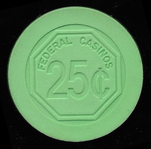 | 93. | Federal Casinos Tasmania Australia, 0.25 Green plastic chip, hexagon inlay