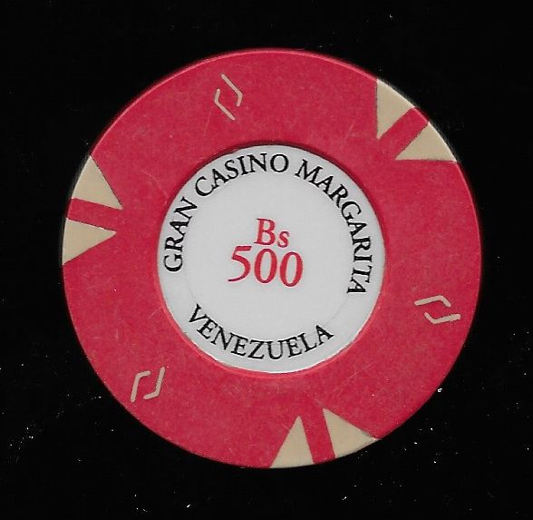 | 99. | Gran Casino Margarita Margarita Island Venezuela, 500.00 Red chip, plain mold, mustard inserts, circle inlay