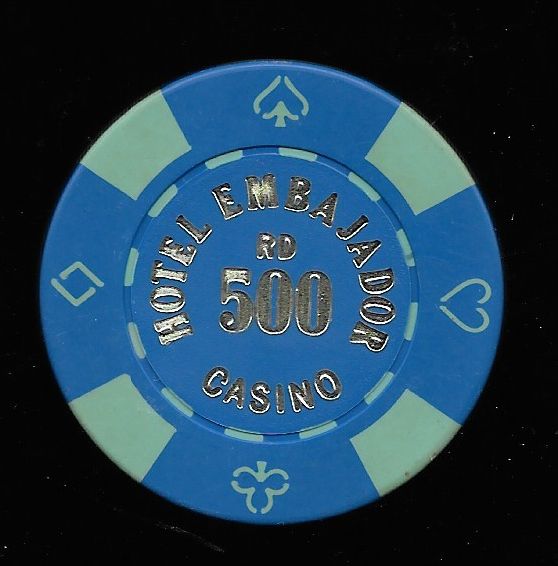 | 110. | Hotel Embajador Dominican West Indies, 500.00 Blue chip, 4 aqua inserts, Langworthy inlay, 4Suits mold