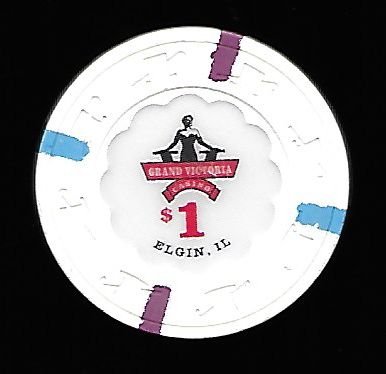 | 6. | Grand Victoria Casino Elgin IL, 1.00 White chip, H&C mold, 2 blue / 2 purple inserts, scalloped inlay