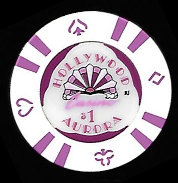 | 10. | Hollywood Casino Aurora IL, 1.00 White chip, 8 narrow purple inserts, amphitheater hologram