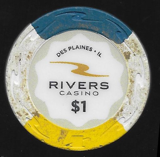 | 14. | Rivers Des Plains IL, 1.00 White chip, River mold, scalloped inlay, 1 purple / 1 yellow wide inserts