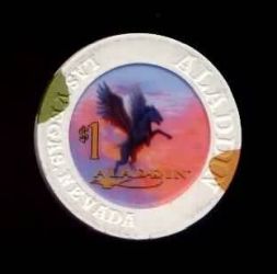 | 2. | Aladdin Las Vegas NV, 1.00 White chip, house mold, 1 ochre-v / 1 olive-v inserts, winged horse against colored sky