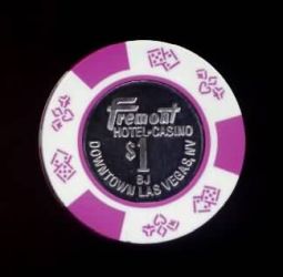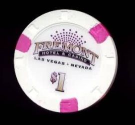 | 92. | Fremont Las Vegas NV, 1.00 White chip, suits/dice mold, 3 purple inserts, metal inlay
