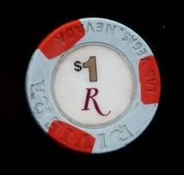 | 228. | Riviera Las Vegas NV, 1.00 Light blue chip, 3 wide red inserts, House mold, R monogram in center