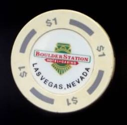 | 27. | Boulder Station Las Vegas NV, 1.00 White chip, 4 long narrow blue inserts, steam engine center design