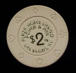 | 217. | Plaza Las Vegas NV, 2.00 Tan chip, Poker & Pan, Bud Jones, circle inlay, hotstamped