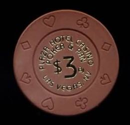 | 218. | Plaza Las Vegas NV, 3.00 Brown chip, Poker & Pan, Bud Jones, circle inlay, hotstamped
