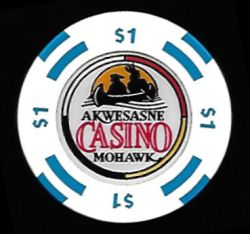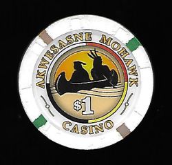 | 1. | Akwesasne Mohawk Casino Hogansburg NY, 1.00 White chip, H&C mold, 2 brown / 2 green inserts, circle inlay, Indians in canoe
