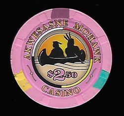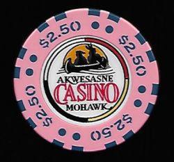 | 3. | Akwesasne Mohawk Casino Hogansburg NY, 2.50 Pink chip, blue inserts, circle inlay, Indians in canoe