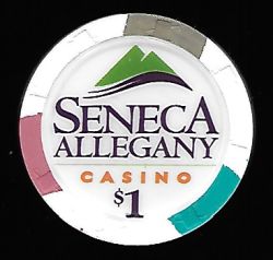 | 13. | Seneca Allegany Salamanca NY, 1.00 White chip, 1 red / 1 green / 1 brown inserts, circle inlay, Top Hat mold