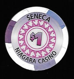 | 15. | Seneca Niagara Casino Niagara NY, 1.00 White chip, 3 wide purple/pink/blue inserts, horseheads in center circle