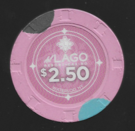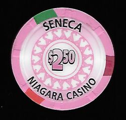 | 16. | Seneca Niagara Casino Niagara Falls NY, 2.50 Pink chip, H&C mold, orange / red / green inserts, circle inlay, horseheads in circle