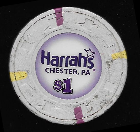 | 1. | Harrah's Chester PA, 1.00 White chip, H&C mold, 2 purple / 2 yellow inserts, circle inlay