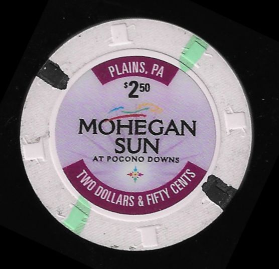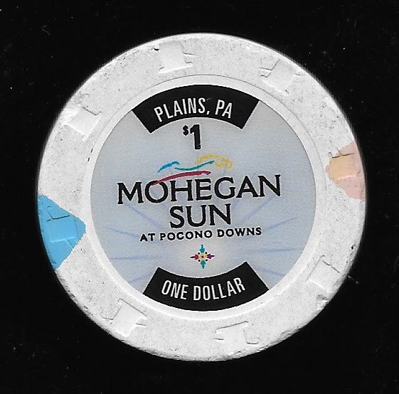 | 2. | Mohegan Sun at Pocono Downs Plains PA, 1.00 White chip, H&C mold, 1 purple / 1 orange triangle insert, circle inlay