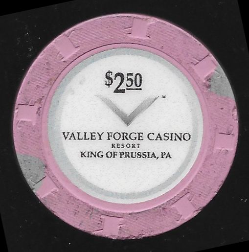 | 10. | Valley Forge Casino King of Prussia PA, 2.50 Pink chip, H&C mold, 2 green triangle inserts, circle inlay