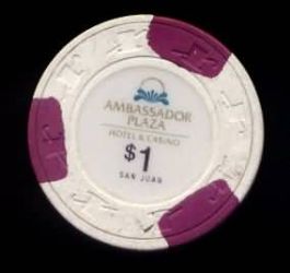 | 1. | Ambassador Plaza San Juan Puerto Rico, 1.00 White chip, wide maroon inserts, top hat mold