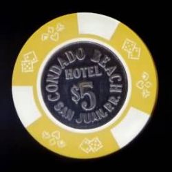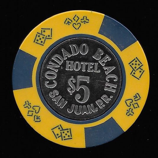 | 14. | Condado Beach Hotel San Juan Puerto Rico, 5.00 Yellow chip, navy inserts, coin in center, Bud Jones