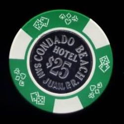 | 20. | Condado Beach Hotel San Juan Puerto Rico, 25.00 Green chip, 3 white inserts, DieCards mold, coin in center, Bud Jones
