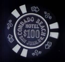 | 22. | Condado Beach Hotel San Juan Puerto Rico, 100.00 Black chip, 6 gray inserts, DieCards mold, coin in center, Bud Jones