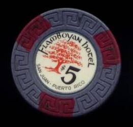 | 32. | Flamboyan Hotel San Juan Puerto Rico, 5.00 Gray chip, 3 red inserts, Large Key mold, circle inlay, back inlay missing
