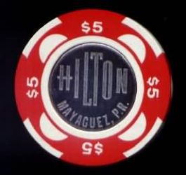 | 38. | Mayaguez Hilton Mayaguez Puerto Rico, 5.00 Red chip, 4 horizontal white inserts, 4 semicircle inserts, metal inlay