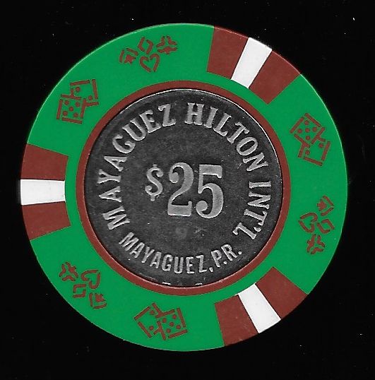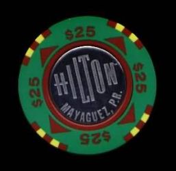 | 39. | Mayaguez Hilton Mayaguez Puerto Rico, 25.00 Green chip, circle inlay, DieSuits mold, coin center